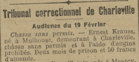 | Krauss | Ernest | Tribunal correctionnel de Charleville | 1919 | né à Mulhouse demeurant à Charleville (Ardennes) | Le Petit Ardennais 23 Février 1919 | ||
