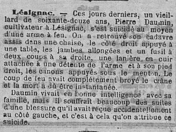 Daumin | Pierre | 72 ans | cultivateur à Lésignac | Décès | 1883 | souffrait beaucoup des suites d'une blessure | La Charente 3 Mai 1883 |