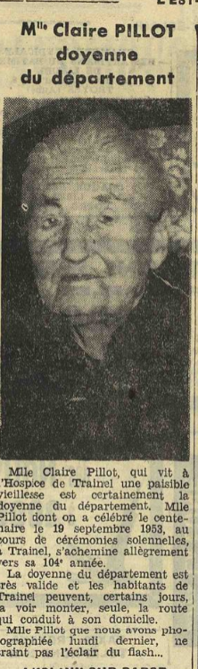 Pillot![]() Pillot Claire | Claire | 103 ans | retraitée | centenaire | 1957 | Hospice de Traînel née le 19 Septembre 1853 Doyenne du département | Est Eclair 6 Février 1957 |